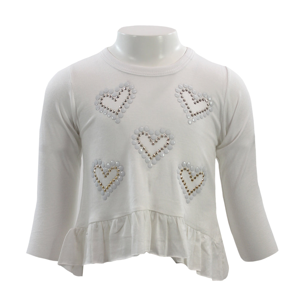 Rock-n-Beauty Long Sleeve Hi Lo Shirt has white and gold heart embellishments and a ruffle on the bottom of the hi-lo hem.